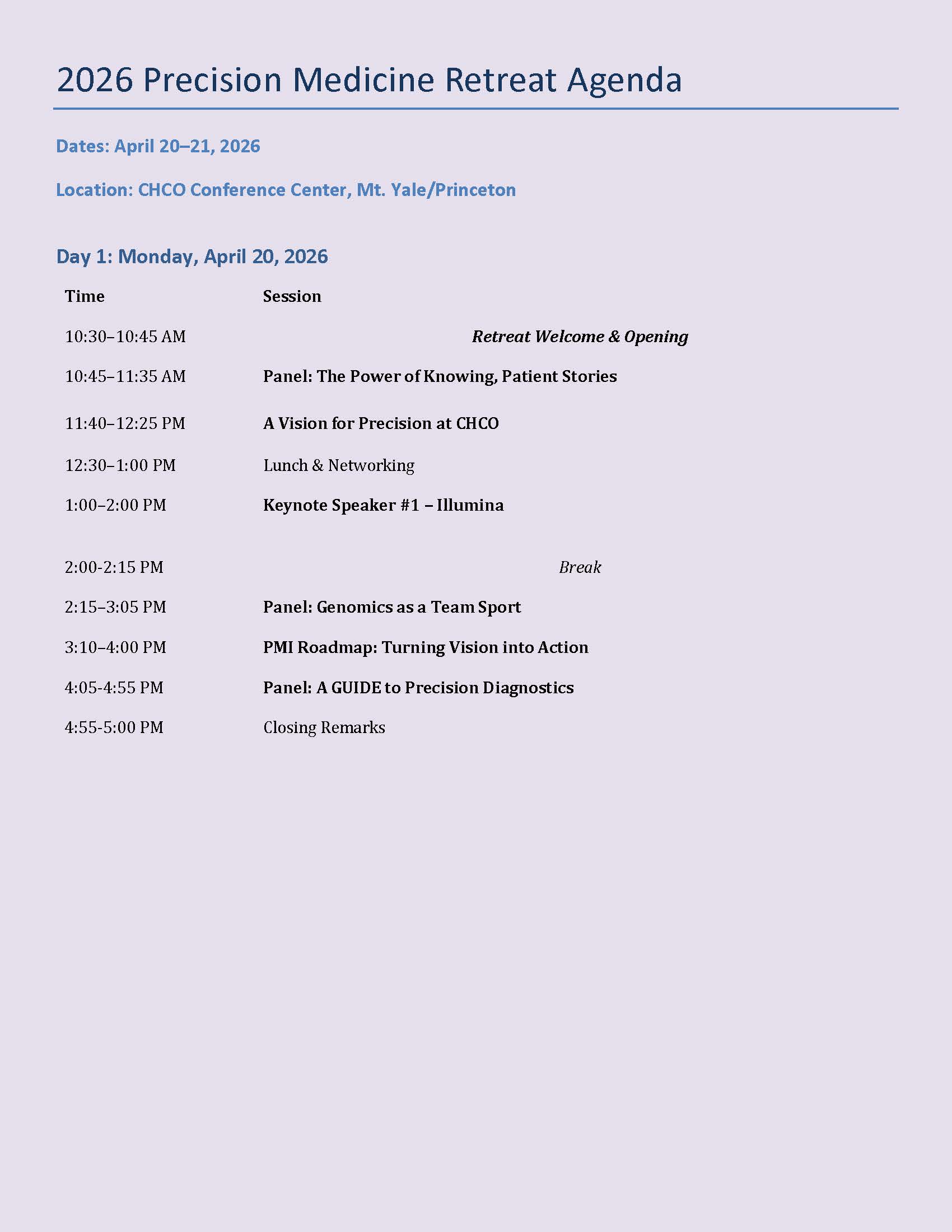 The Retreat aims to deepen our organization’s understanding and awareness of precision medicine, highlight the innovative work happening across our community, and foster shared learning to enhance knowledge and engagement with this evolving field.
