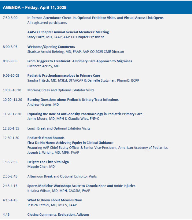 AAP Colorado's Annual CME Conference is a full-day Live event. Participants are welcome to attend either in person or virtually. The format includes interactive case-based discussions and time for questions and answers. Technology will allow audience participation. This year's conference promises to be informative, engaging, and collaborative, with a design focused on creating a lasting learning experience.