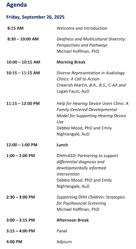The Planning Committee reserves the right to modify the agenda content while keeping consistent the time and content requirements for ASHA CEUs, or cancel this conference, or if minimum acceptable registration is not attained by September 5, 2025, with a full refund to participants.