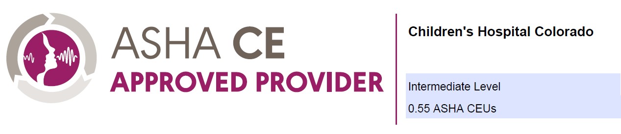 Children’s Hospital Colorado is approved by the Continuing Education Board of the American Speech-Language-Hearing Association (ASHA) to provide continuing education activities in speech-language pathology and audiology. See course information for number of ASHA CEUs, instructional level and content area.