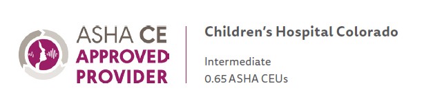 Children’s Hospital Colorado is approved by the Continuing Education Board of the American Speech-Language-Hearing Association (ASHA) to provide continuing education activities in speech-language pathology and audiology. See course information for number of ASHA CEUs, instructional level and content area.