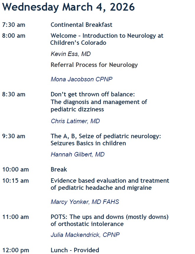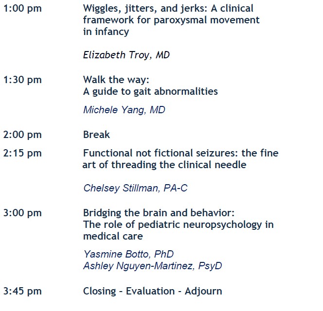 This conference on pediatric neurology is specifically tailored for primary care providers and anyone taking care of patients with neurologic issues. The presentations will offer essential updates and practical guidance to enhance recognition, initial management, and appropriate referrals of common neurological issues in children. The conference will  equip providers with the confidence to conduct effective screening exams, understand the red flags necessitating a prompt subspecialty referral, and implement evidence-based initial treatment plans, fostering a seamless and collaborative approach to pediatric neurological care.