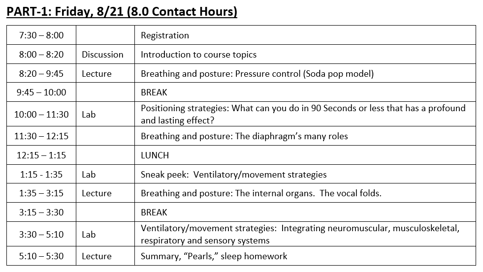 - Utilize a ventilatory strategy algorithm presented in class to optimally match breathing with movements from bed mobility to athletic endeavors.