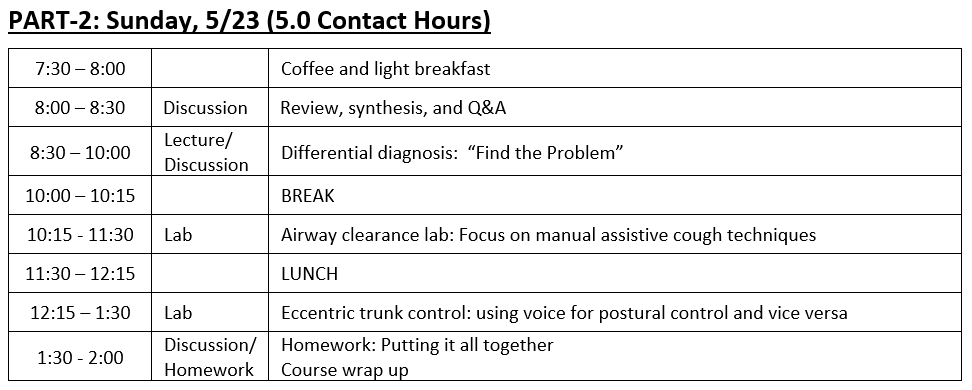 - Evaluate the need for, and demonstrate, neuromotor retraining techniques to improve breath support for voicing and postural control (eccentrics).